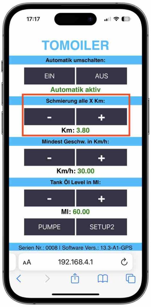 In diesen Menü stellst du die Kilometer ein, bei der der Kettenöler Öl auf die Kette gibt.
